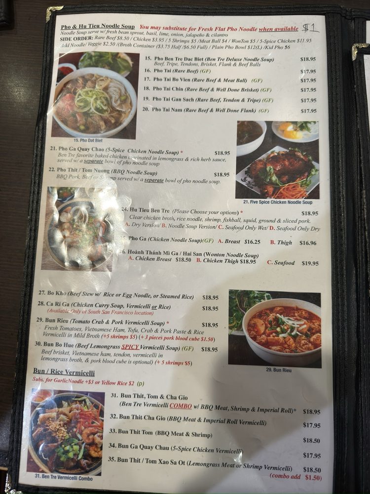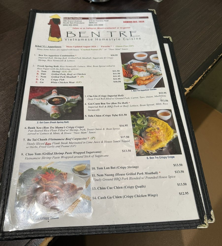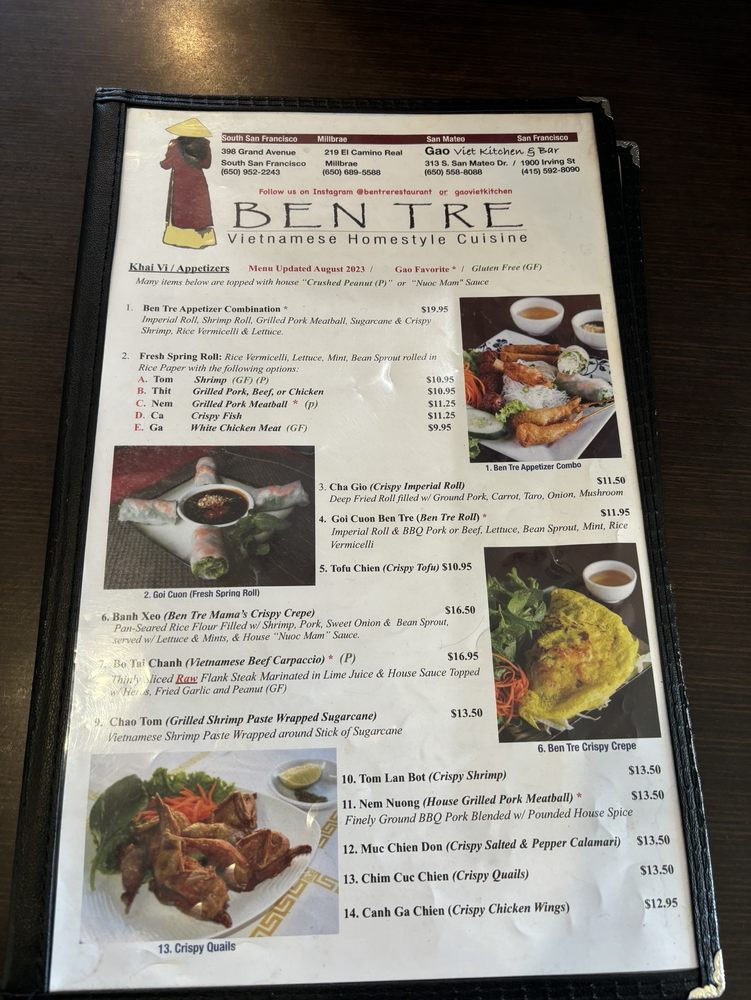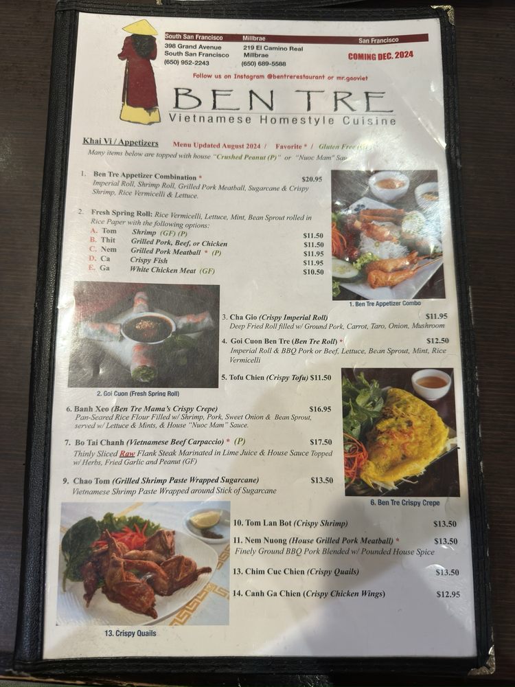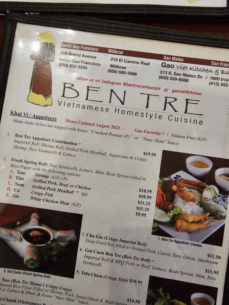 Ben Tre Vietnamese Homestyle Cuisine offers a delightful blend of traditional Vietnamese dishes in a casual setting. Located in South San Francisco, this restaurant provides a wide range of options, from appetizers like the Ben Tre Appetizer Combo to flavorful Goi Salads and Pho Hu Tieu Noodle Soup selections. Customers rave about the Bun Rieu, Fresh Spring Rolls, and Green Papaya Salad, highlighting the diverse textures and rich flavors of the cuisine. The restaurant's commitment to customer satisfaction is evident in their accommodating options for vegan, vegetarian, and allergy-sensitive diners. With quick service and a warm atmosphere, Ben Tre is a go-to spot for authentic Vietnamese homestyle cooking in the Bay Area.